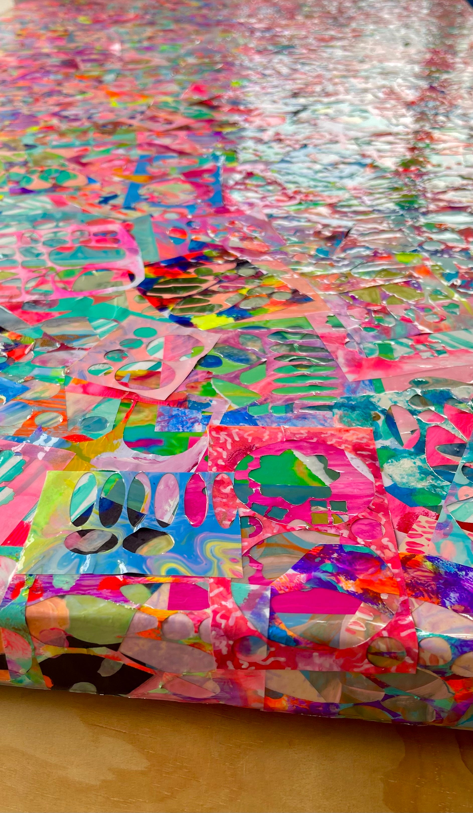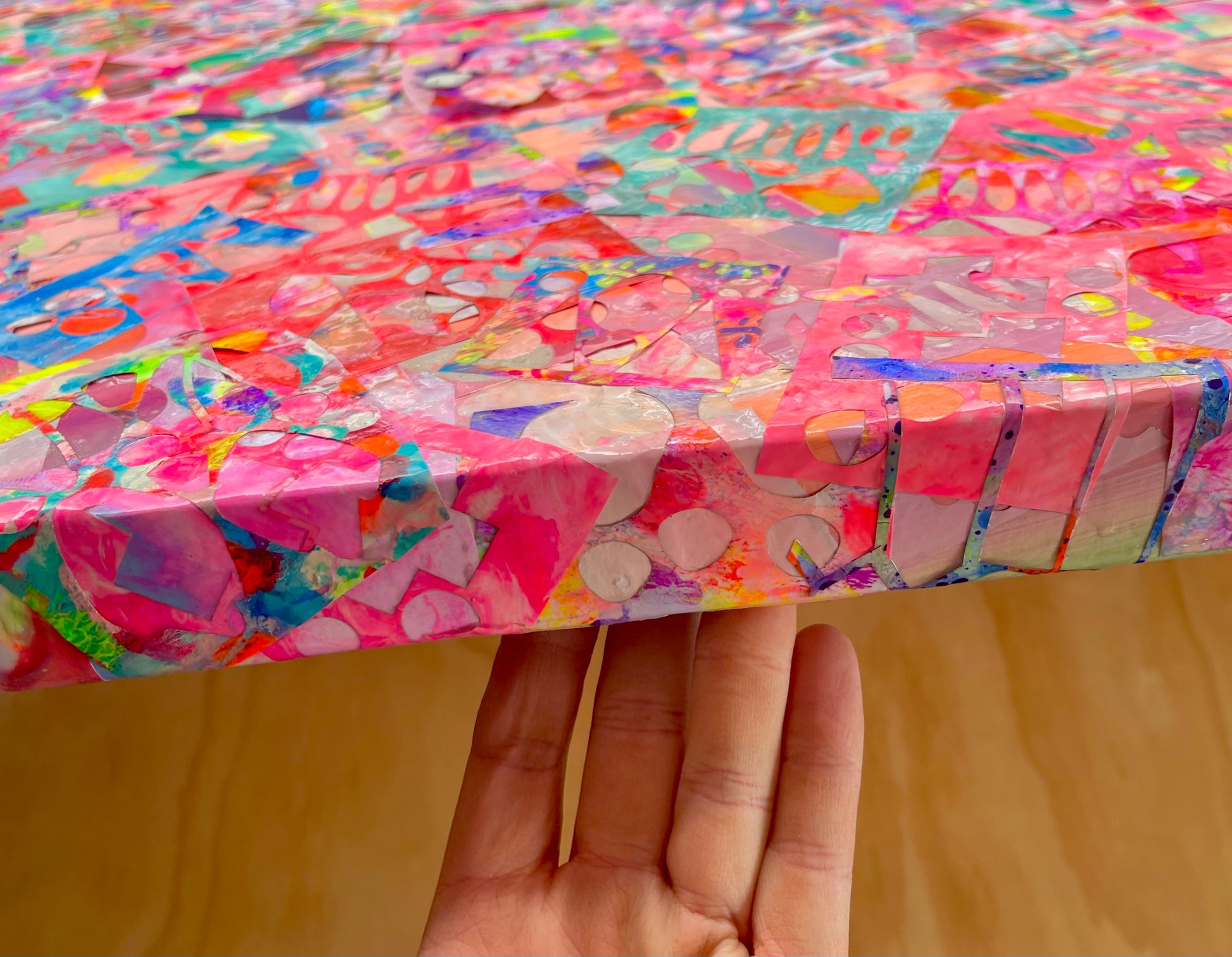 With every piece of “waste” comes an opportunity to recycle… and what beautiful waste we have! This canvas is truly one-of-a-kind, layered with colour, texture, and story.
